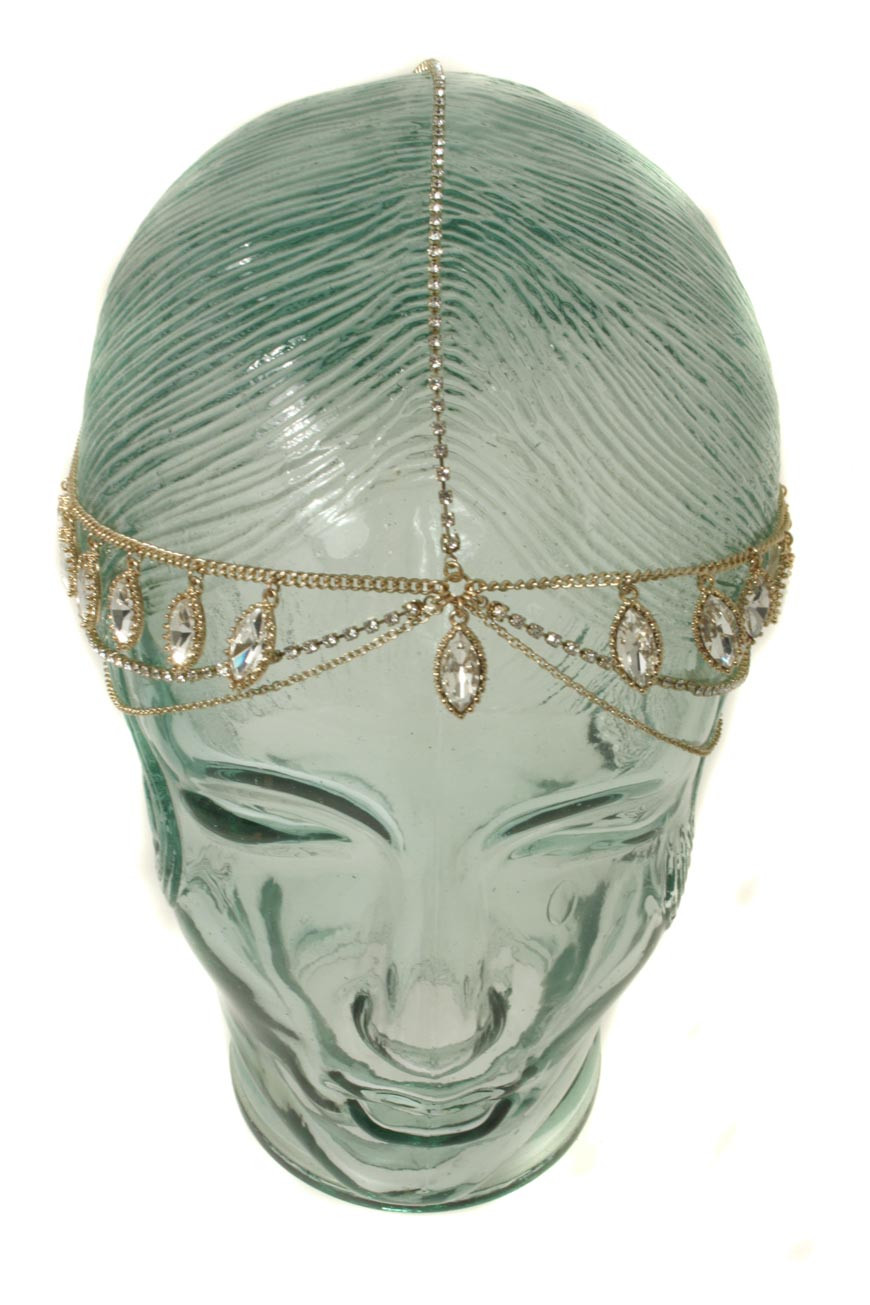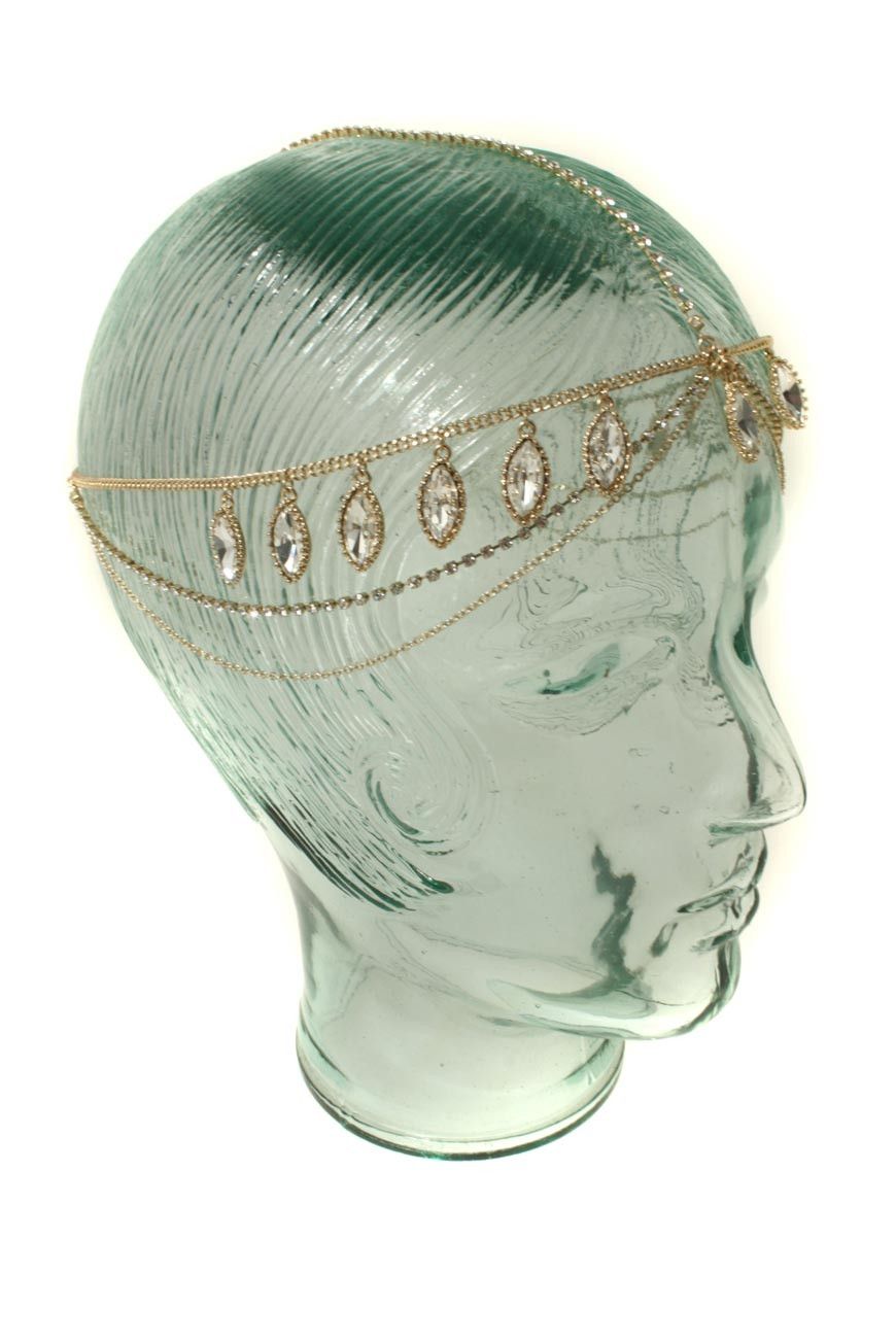 This vintage hair band by Love Rocks has a T-shaped chain design. It has a row of diamantes designed to sit along the top of the head, with three rows of chain, diamantes and a crystal jewelled chain which sit across the forehead. The back of the headband is black elastic, and it has some stretch for comfort.