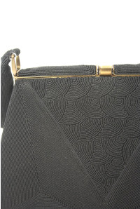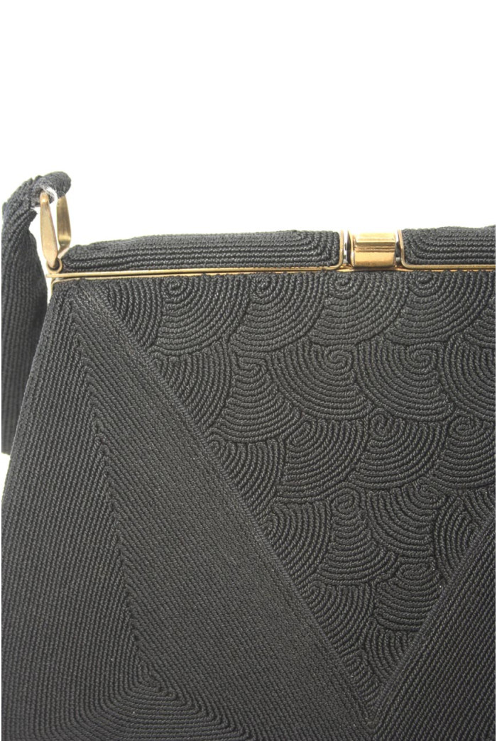 This vintage black cord bag measures 22cm by 18cm. It has a gold frame with a hinged clasp fastening. The bag has a black patterned cord detail in an linear style. The lining is black and it has three smaller inside pockets. The Corde label is stitched into the inside of the bag. This handbag is in good vintage condition with no notable wear.