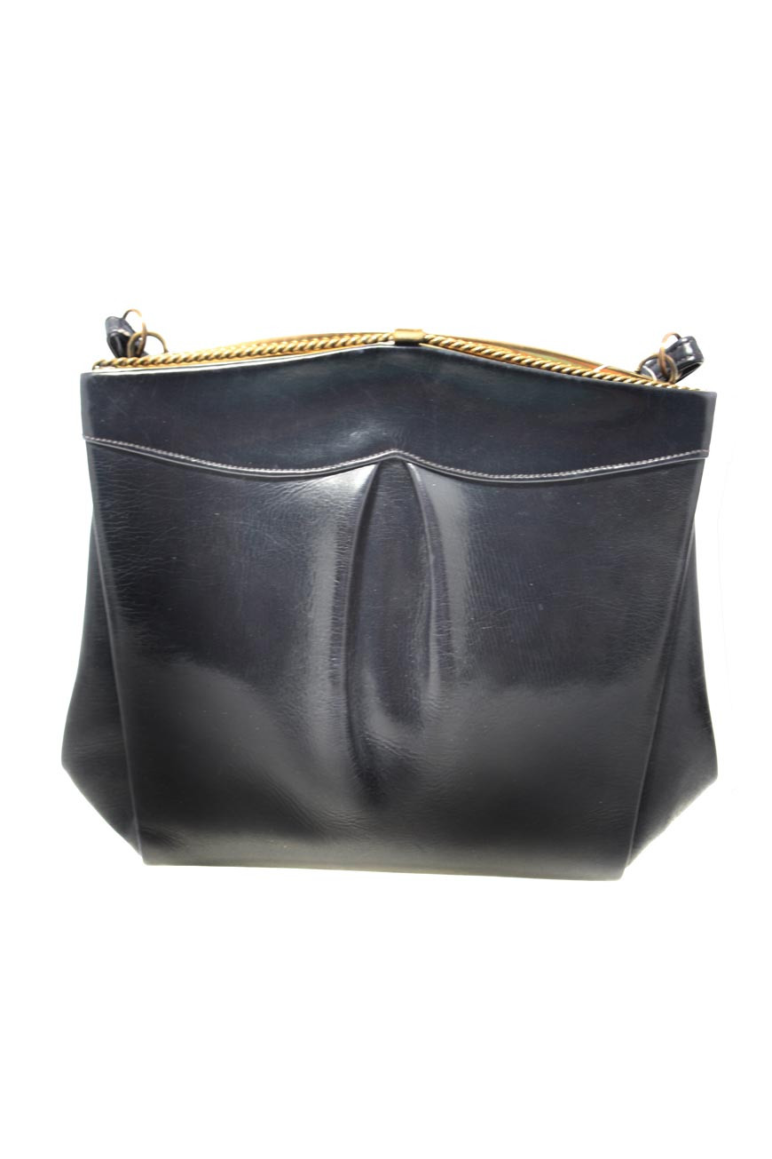 This is a vintage bag in navy faux leather with gold hardware. It measures 22cm by 19cm and fastens with a gold clasp, has a textured gold metal frame with a strap measuring 23.5cm. Inside it is lined with navy material and has an inner purse detail with a clasp. It is in good condition.