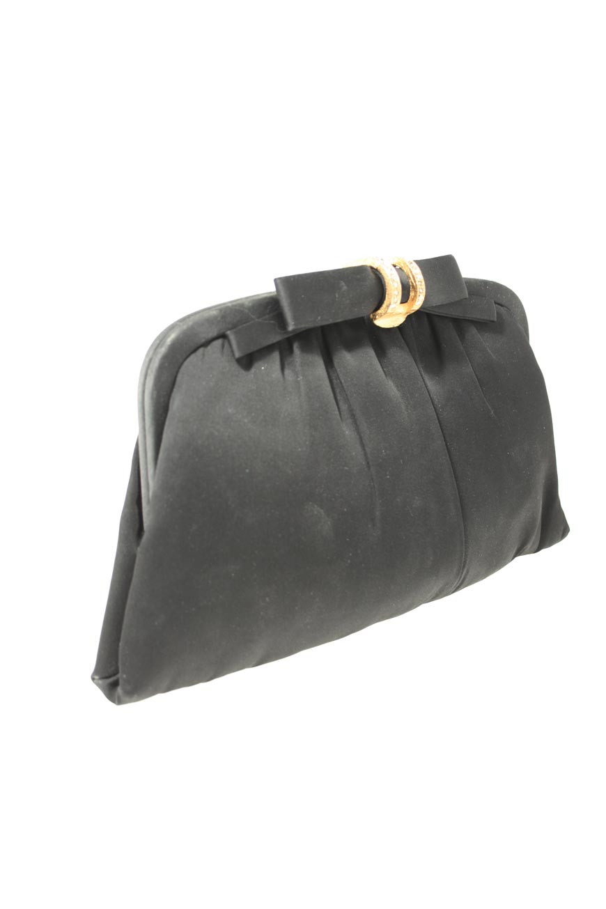 This black vintage evening bag by After Five measures 24cm by 17cm. It has a gold metal curved clasp with diamante detail. The clasp is wrapped around a black fabric bow. There is a gold chain strap on hinges inside to give the option of using this bag as a clutch or a handbag. The strap measures 30cm. It has one main compartment inside and is stamped in gold with the After Five logo. This bag is in good vintage condition.