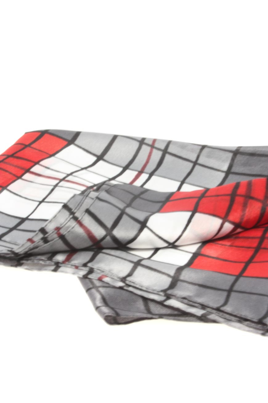 This square printed scarf is made from 100% polyester and is machine washable. It has a grey, white and black grid print, with red sections. It measures 158cm long by 34cm wide.