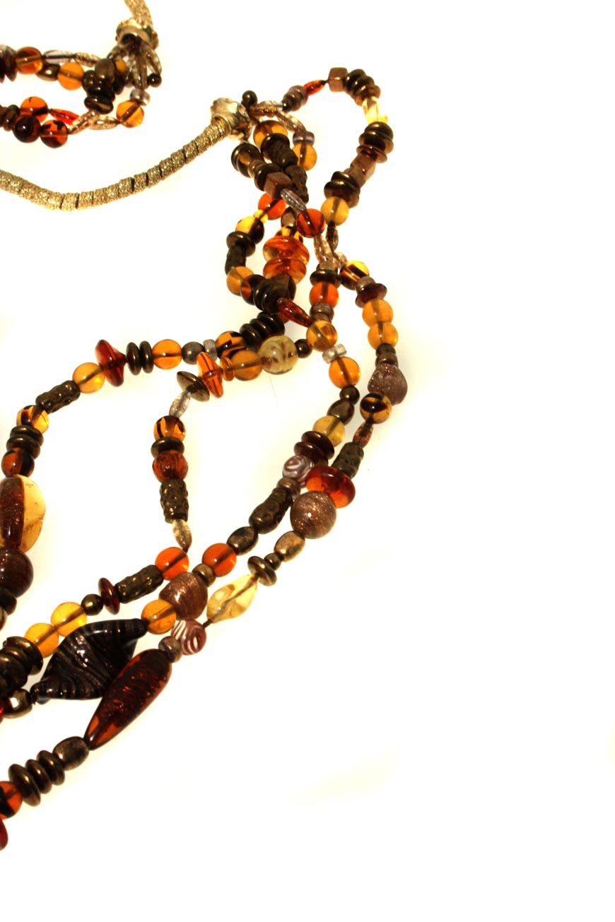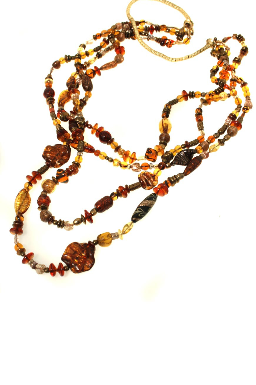 This vintage long length necklace has four strands of glass beading in brown and amber tones. It has a gold textured neck strap and is in excellent condition.