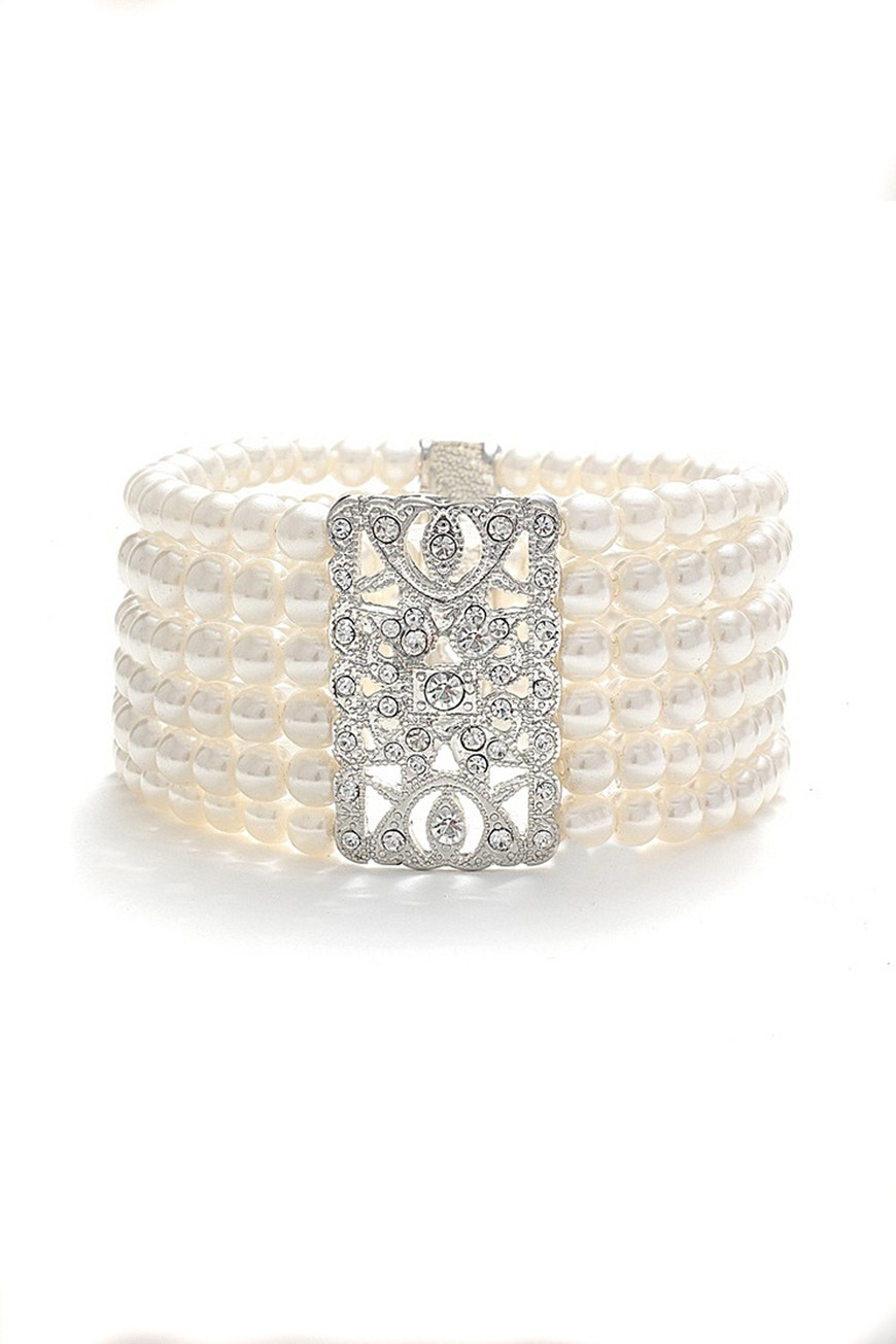It’s not just diamonds that are a girl’s best friend – we think this art deco pearl bracelet would certainly make for a good accessory chum too! This beautiful beaded cuff has six rows of perfectly pretty pearls teamed with a wonderful art deco diamante central section with cut out details. Why not rock these vintage style pearls with a flapper dress and sparkling head piece to complete the stunning 1920s look?