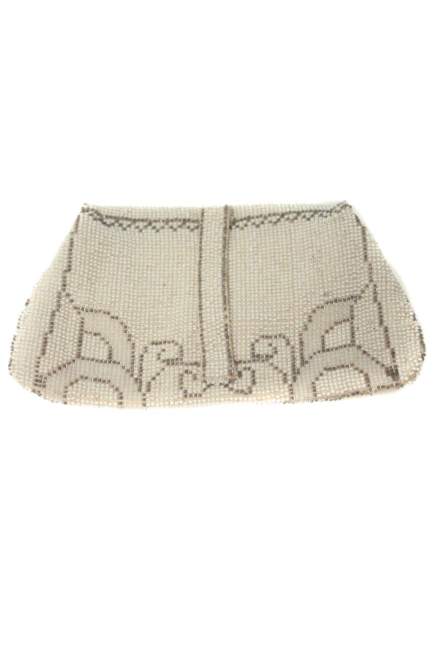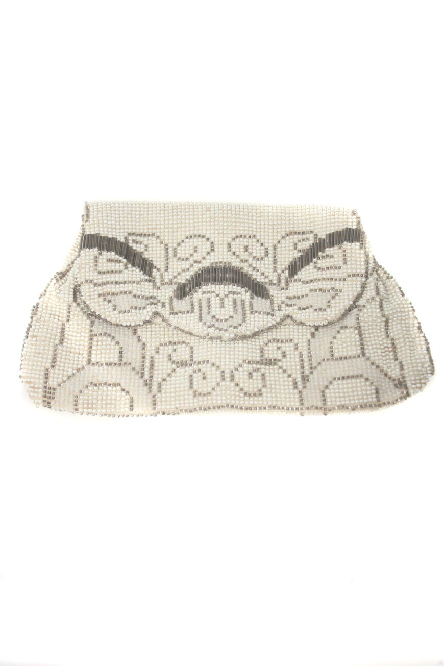This 1930s flapper purse measures 18cm by 10cm. It fastens with a press stud, and has two inside compartments which are lined in a cream silky material. It is embellished with cream and grey beading all over, and all of the original beadwork is intact. The reverse of the bag features a narrow hand strap. This bag is in excellent condition.