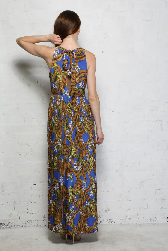 This full length dress by Darling has a floral and leaf print in tones of brown green, blue and red. It is sleeveless with a high round neckline and has vertical pleats down the bodice and skirt. It has an open back detail and ties with a bow at the back of the neck.