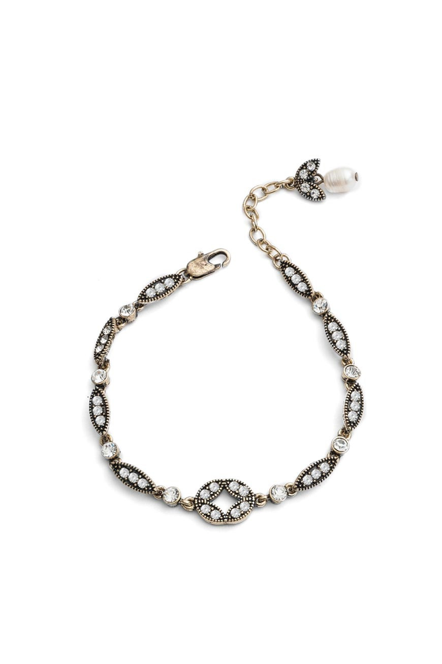 This 1920s bracelet by Lovett & Co is made from antique gold plated brass. It features an art deco design with diamante embellishments. This bracelet has an adjustable chain fastening with a pearl drop detail on the end. The matching earrings and necklace are also available.