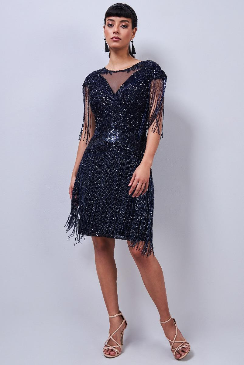 This Sybill Fringe Flapper Navy Dress has an elegant round neckline framed by charming cap fringe sleeves. This dress comes with a beaded fringe dangle from the skirt and sleeves. The front and back are embellished, as are the embellished cap sleeves.