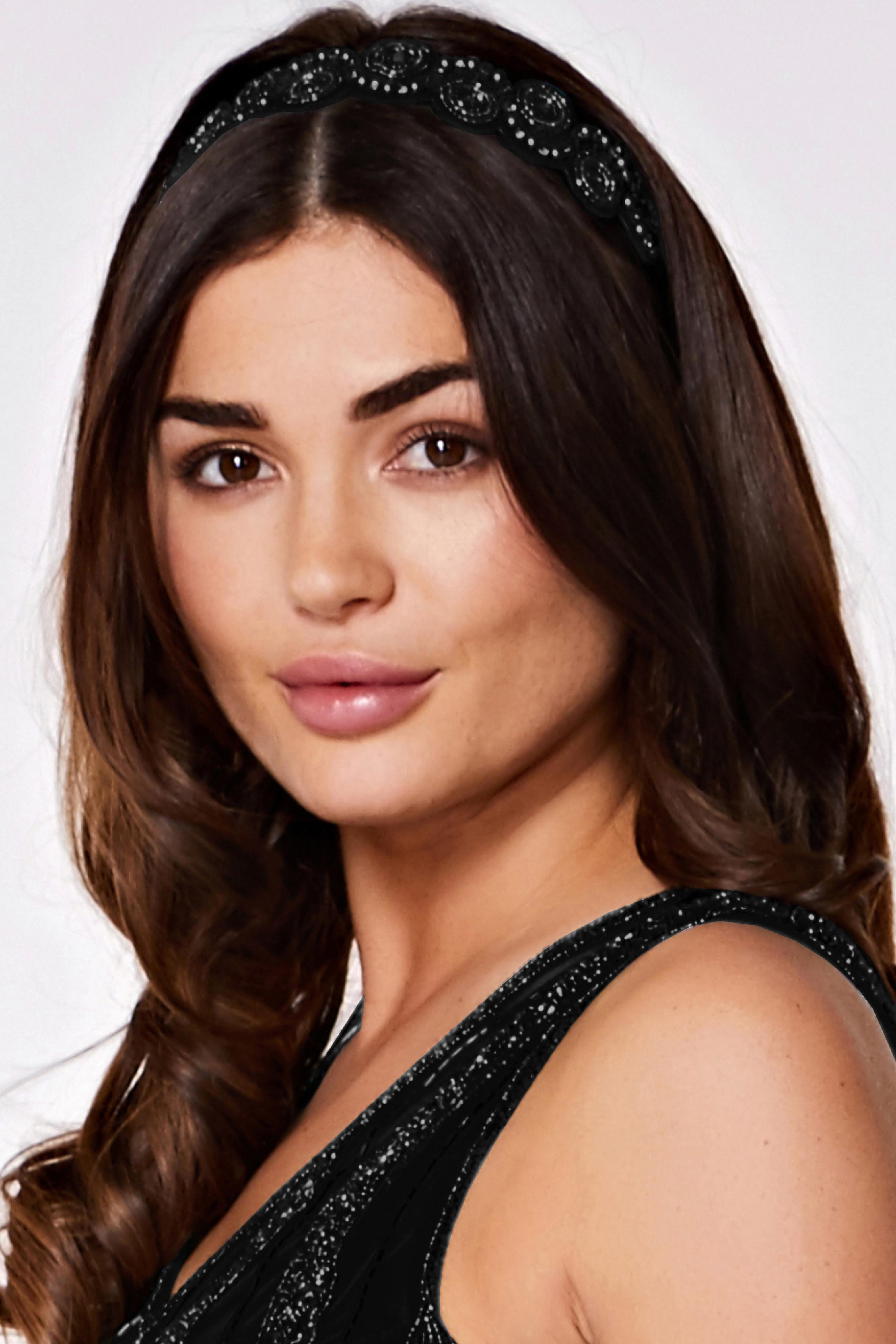 This soft noir flapper headband showcases a sparkling and intricate hand-embellished design. You are the embodiment of the evening's timeless elegance with this headband. You will be the belle of the ballroom when worn with the matching hand-embellished dress.