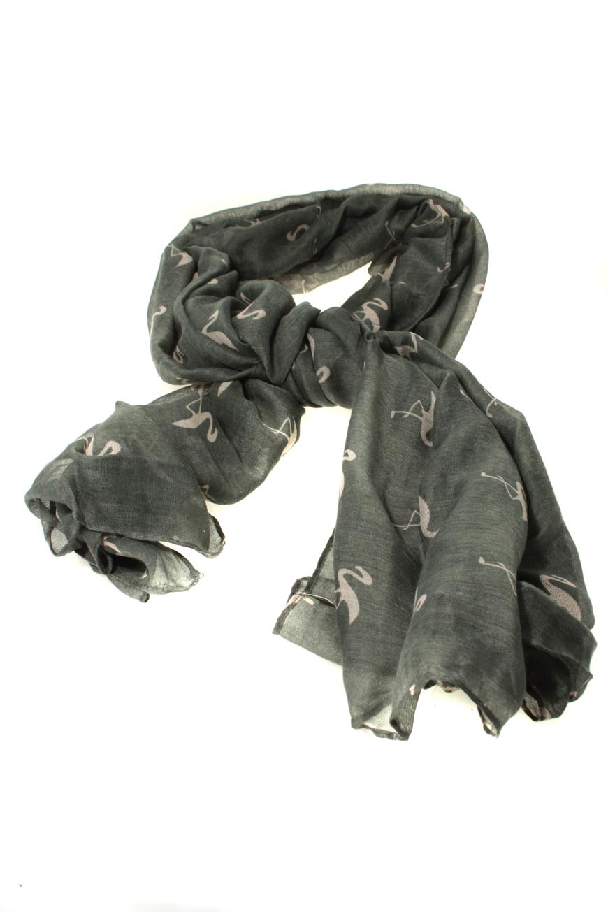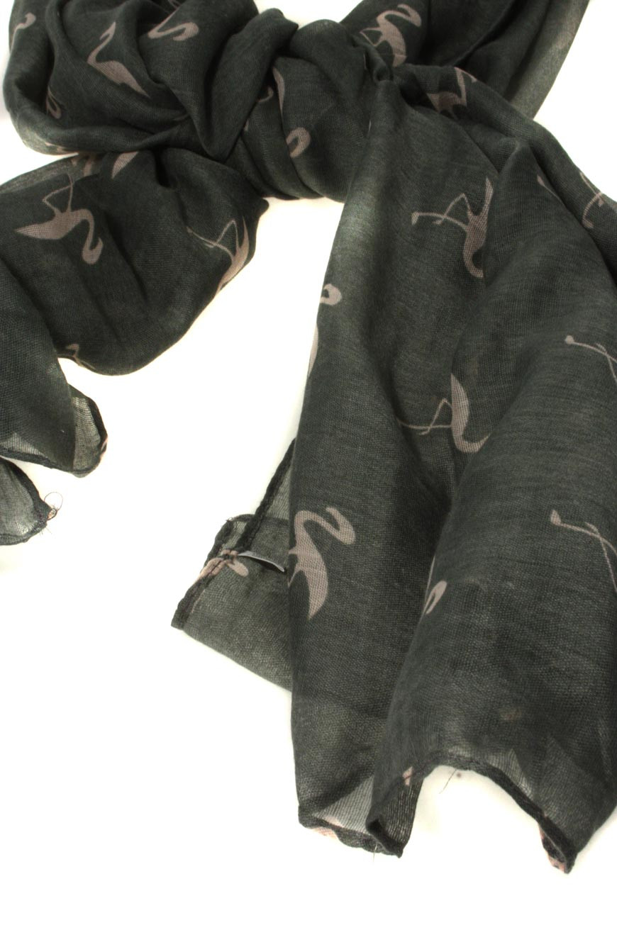 This vintage style scarf is dark green with a flamingo print. It is lightweight and is 100% viscose.