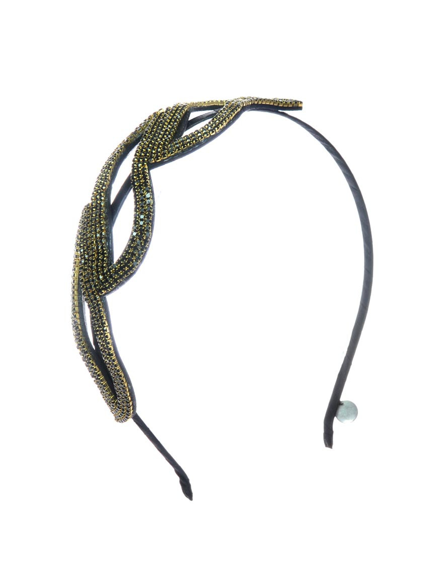 This gold beaded deco headband by Johnny Loves Rosie features a black satin wrapped headband with gold beaded design to be worn on the side of the head.