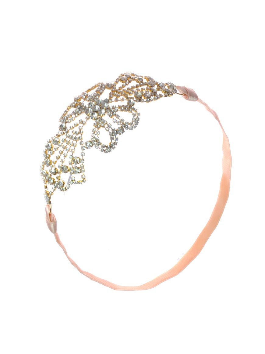 This 1920s style hairband by Johnny Loves Rosie features a light gold elasticated band with a filigree style rhinestone design. The design measures 17cm and the overall length of the band (including design) is 40cm. This headband can be worn with the design to the front or the side.