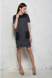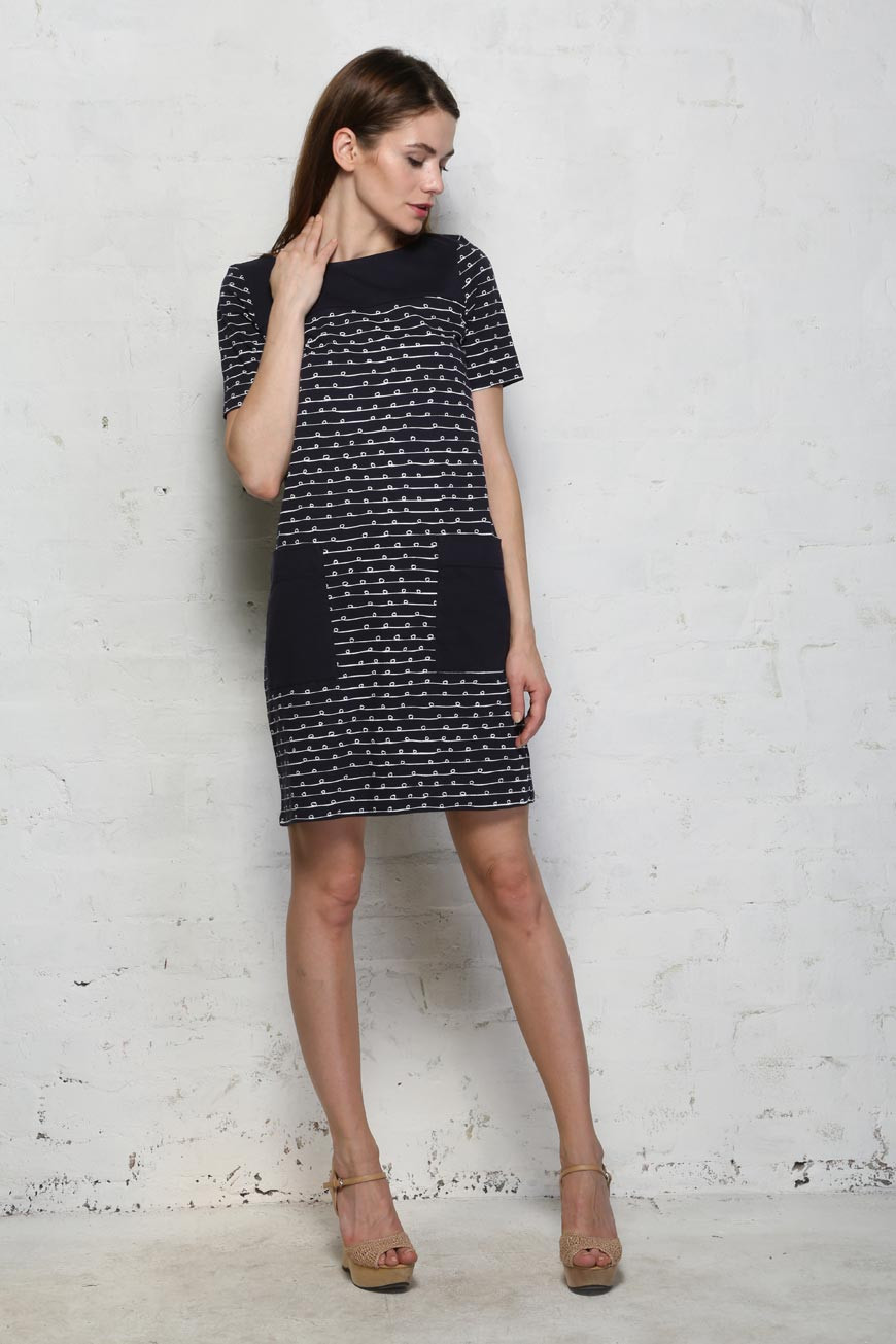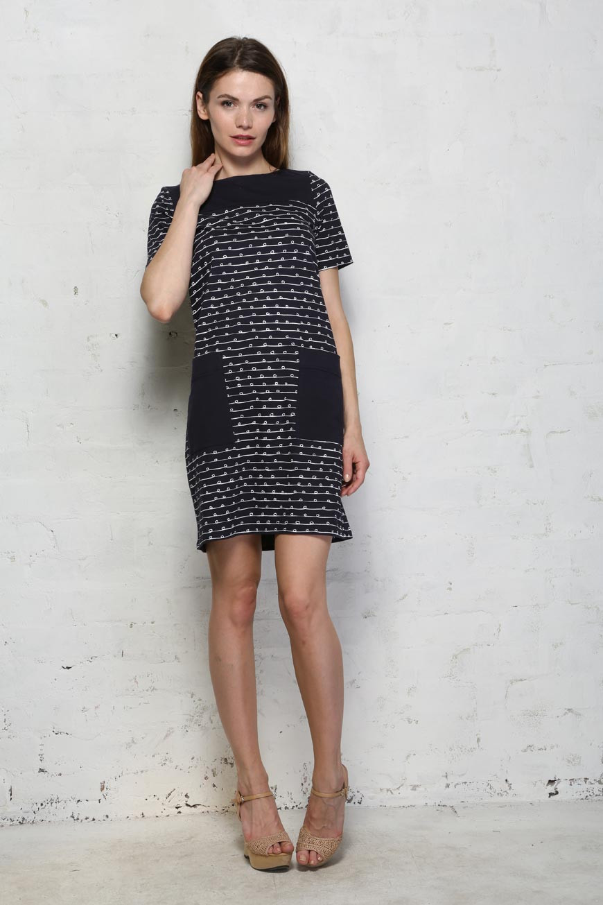 This sixties tunic dress by People tree is navy with white bow print. It has contrasting pockets and neckline. This is a short sleeved t-shirt shape shift dress made from organic cotton.