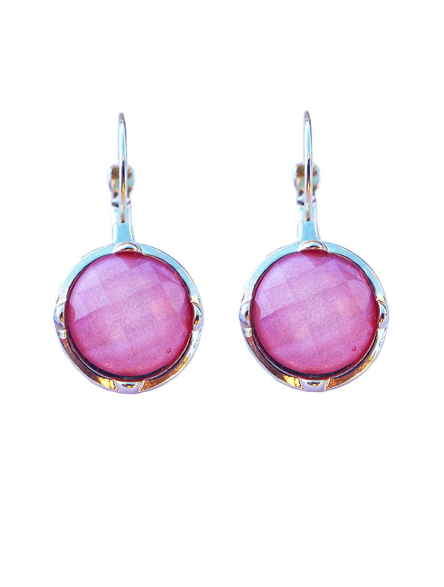 These round statement earrings by Belle and Flo feature a pink faceted crystal on a hinged clasp fastening. They are for pierced ears and are made from plated nickel.