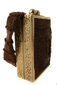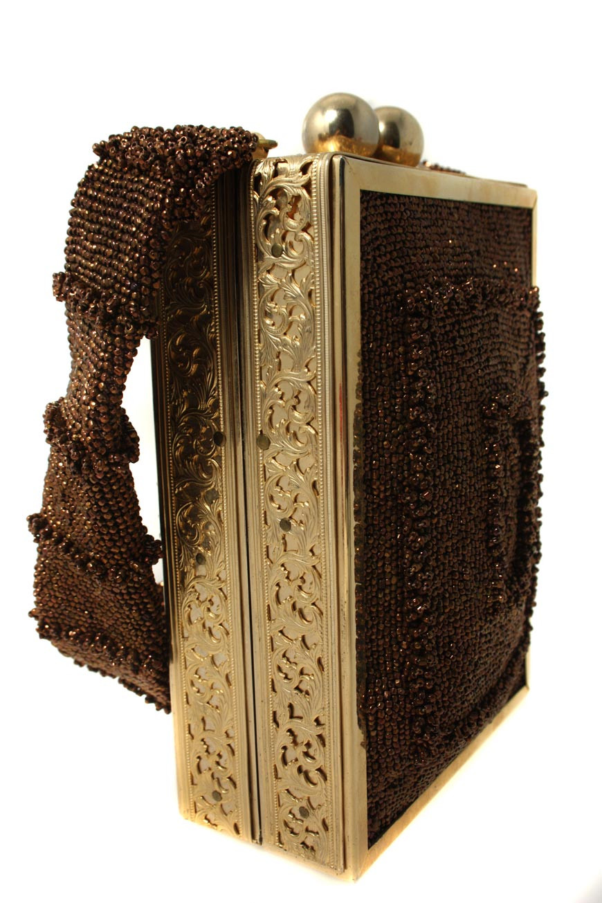 This Fre Mor handbag is a rectangular shape measuring 18cm by 13cm, and is 6cm in depth. It has an ornate gold metal frame which has a floral leaf design and fastens with two ball toggles held with a chunky beaded hand strap. The front and back of the bag is beaded with a woven bronze metallic design in a rectangular pattern. There is a zipped compartment in the centre, with two large compartments on each side. Excellent vintage condition.