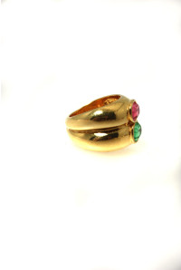 This 1980s ring by Monet is gold with a double stacked detail. It features two oval stones in green and pink, each of which measure 1cm x 0.5cm. It is stamped inside with Monet and is a ring size Q. This ring is in excellent condition.