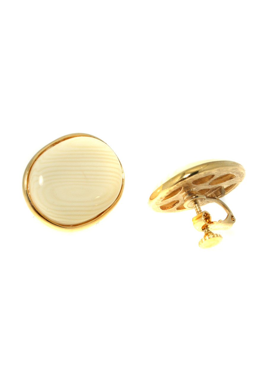 These are 1960s vintage earrings featuring a large gold oval frame holding a cream perspex centre with marbled, almost wood grain, effect. The clip-on earrings fasten with a gold screw fastener and bear the Napier mark. Measure: 2.5 x 2cm.