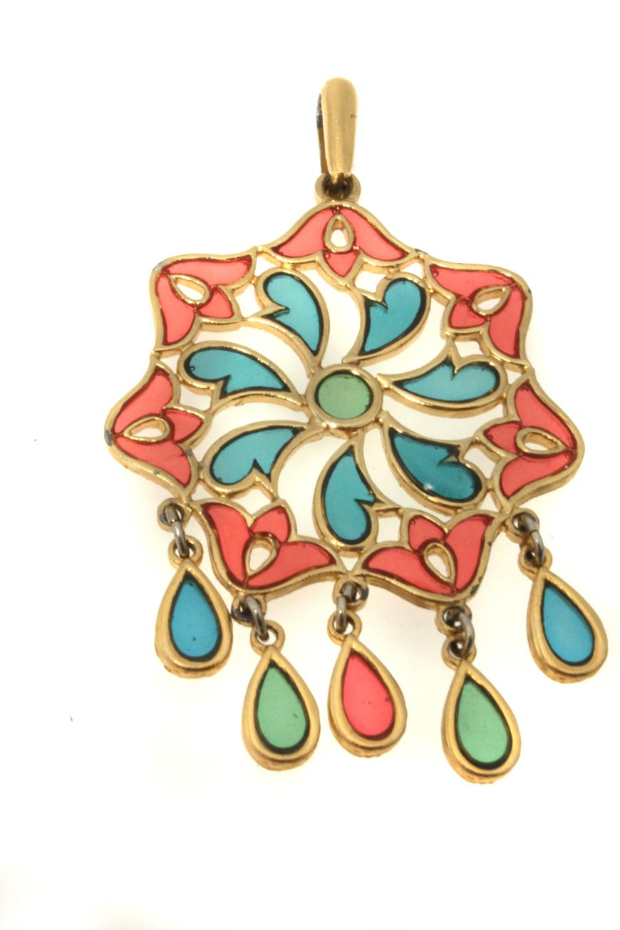This vintage necklace pendant by Trifari measures 5cm by 6cm. It has a stained glass design in a flower shape, with 5 hanging teardrop beads. This pendant is marked with the Trifari stamp on the loop for a chain to go through. It is in excellent condition.